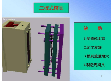 細水口模具又叫三板式模具,的流道及澆口不在分型線上,一般直接在產品上,所以香蕉黄视频下载在設計的時候多一組水口分模線,設計較為複雜,加工較困難,一般要視產品和客戶要求而選用細水口係統。這種模具的澆口位置選擇的地方比較多,而且開模時流道澆口與產品會自動分開,也省去了剪澆口這一步驟,被稱呼為三板式模具
