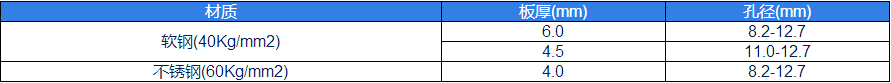 材質板厚(mm)孔徑(mm)軟鋼(40Kg/mm2)6.08.2-12.74.511.0-12.7不鏽鋼(60Kg/mm2)4.08.2-12.7